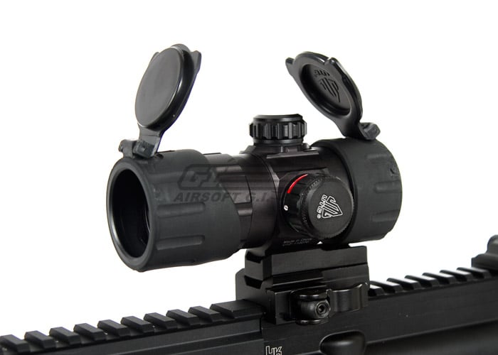 The UTG CQB Red/Green Dot Sight is a high quality quick aim red dot sight that is perfect for a CQB style set up. The UTG CQB Red dot sight is constructed using a precision made and robust one piece metal tube for maximum strength and durability. This sight features a large viewing aperture which enables the user to maintain a great field of view and unlimited eye relief. Also featured on this scope is a illuminated reticle to allow the user to quickly and easily acquire the reticle even in low light conditions. To help the user maintain a perfect cheek weld on the stock of their rifle the UTG CQB sight includes a high and low QD style mount.