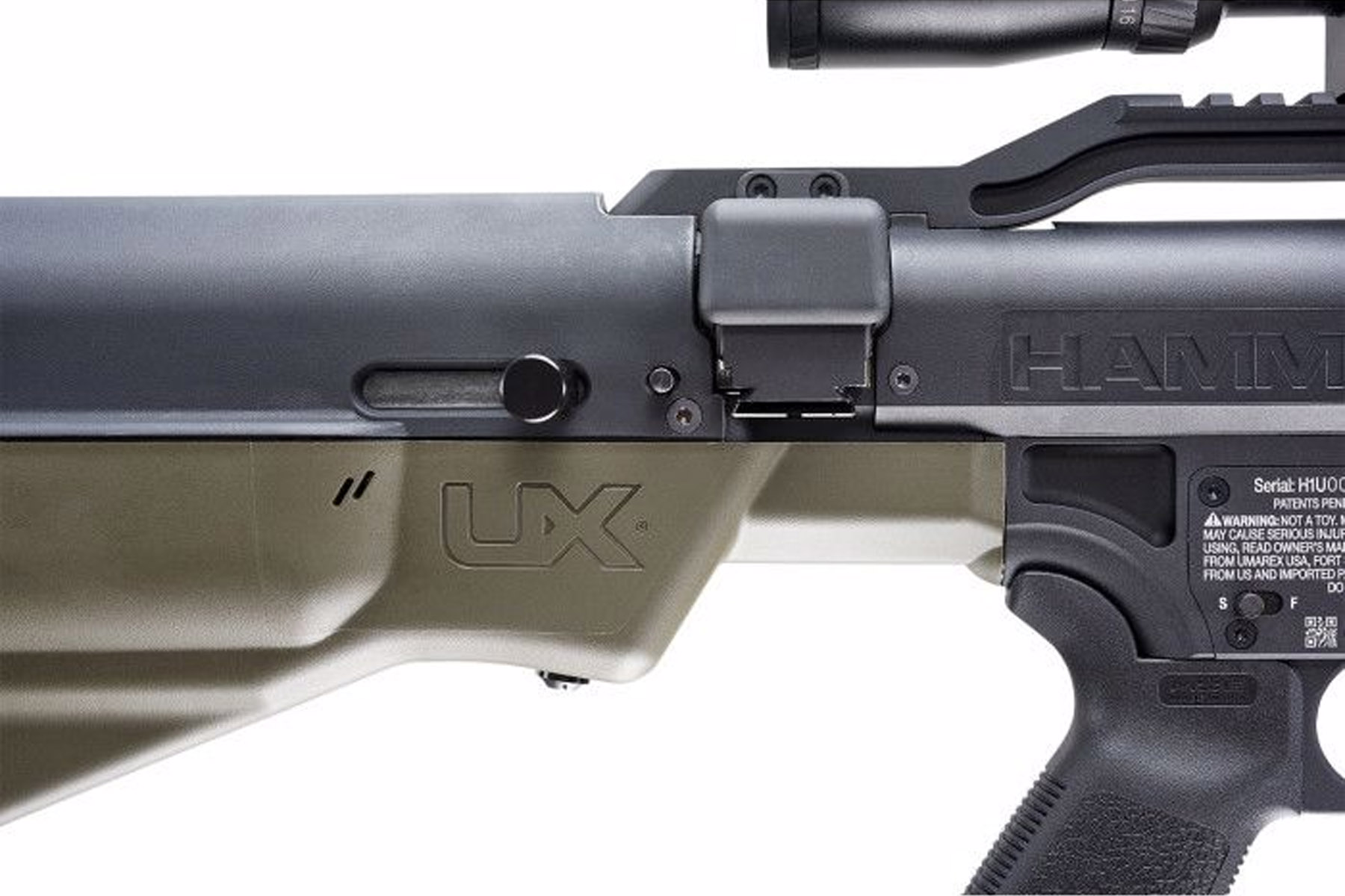 The Hammer’s stock is proudly designed and manufactured in the U.S., featuring an AR Magpul-style grip for comfort and control. A Picatinny riflescope rail allows easy optic mounting, while the integrated rear sling stud and M-LOK-compatible forearm slots provide customization options. The built-in manometer gives at-a-glance air pressure readings, and the quick disconnect Foster fitting allows fast and easy refills.