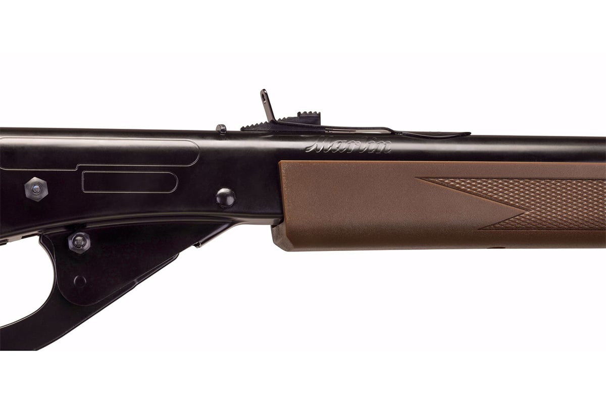 The durable polymer stock is designed to look like classic wood, complete with a rich faux-wood finish that adds a touch of authenticity. Textured grips ensure a secure hold, while the adjustable rear sight allows for precision aiming. Weighing in at just over 3 lbs, the Umarex Marlin is easy to handle, making it perfect for younger shooters and enthusiasts alike.