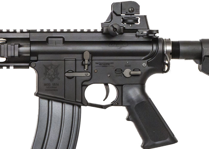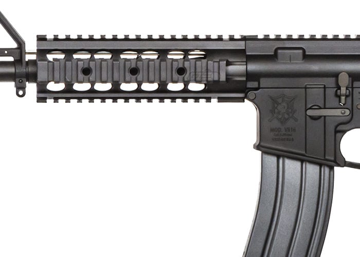 The VFC Full Metal Gen II VR16 Fighter Carbine AEG Airsoft Gun is an impressive addition to VFC's world-renowned line up of full metal airsoft guns. The first thing you will notice when holding the VR16 is how sturdy it feels. This can be attributed to it's full metal body and flush-mounted 7 inch rail system. The battery for the gun is housed in the QRS stock, which is fully adjustable. Both the front and rear flip-up sights are removable, providing far more than enough rail space for the addition of your favorite optics. Internally, the gun features the same high quality full metal gearbox that has made VFC so famous, with it's self-shimming gears, polycarbonate piston, and functioning bolt catch. If you are looking to pick up a new AEG that will be both the best looking and best performing AEG on the field, be sure to check out the VFC Full Metal Gen II VR16 Fighter Carbine AEG Airsoft Gun. The VFC QRS Stock combines several features prevalent in aftermarket tactical stocks of today while introducing new innovations. The stock is retracted by pulling the adjustment lever to the rear, unlike most other modern and past stocks for the AR platform which have required the user to pull up and backwards to change positions. For battery storage, the rear of the QRS stock (secured by two press-in tabs) swings up to allow for either a single stick-type LiPo battery to sit vertically or upon removal of the storage tube caps, a nunchuck-type battery pack to be position horizontally like in a crane stock. Lastly, among the other innovative external features of the QRS Stock, there is a single picatinny rail section built into the bottom of the stock's butt to accept a monopod. Specifications:Manufacturer: VFC