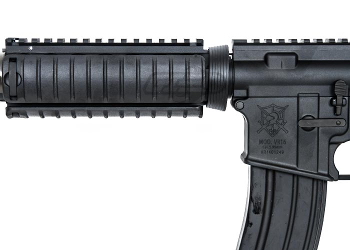 The VFC Full Metal VR16 SOPMOD CQBR AEG Airsoft Gun is an impressive addition to VFC's world-renowned line up of full metal airsoft guns. The first thing you will notice when holding the VR16 is how sturdy it feels. This can be attributed to it's full metal body and 7 inch rail system. The battery for the gun is housed in the crane stock, which is fully adjustable, the rear flip-up sights are removable, providing far more than enough rail space for the addition of your favorite optics. Internally, the gun features the same high quality full metal gearbox that has made VFC so famous, with it's self-shimming gears, polycarbonate piston, and functioning bolt catch. If you are looking to pick up a new AEG that will be both the best looking and best performing AEG on the field, be sure to check out the Full Metal VR16 SOPMOD CQBR AEG Airsoft Gun.