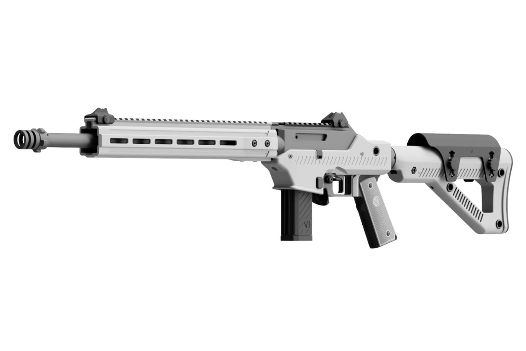 Crafted with a CNC-machined aluminum alloy upper and a high-impact polymer lower, the VMP-2D is lightweight, rugged, and ready to be customized. Its 20mm flat-top rail includes front and rear fiber optic sights and ample space for mounting optics or accessories. The rifle’s modular platform supports interchangeable barrels, handguards, and nozzles, giving players full flexibility to adapt their loadout. A 6-position extendable stock and adjustable cheek riser provide a secure and tailored fit, while four QD sling points enable ambidextrous carry options for tactical convenience.