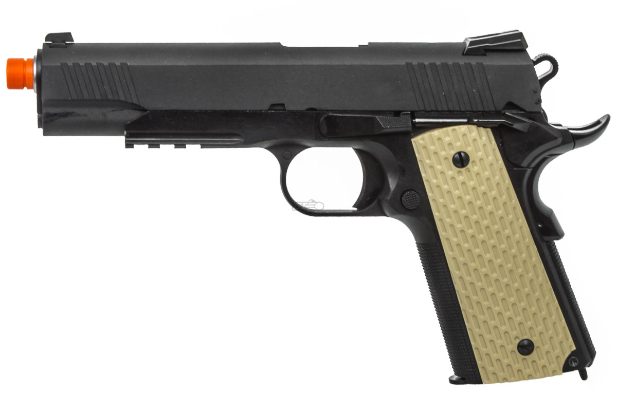 I've been doing airsoft for about 2 years now and only had a upgraded m4. Getting bigger into airsoft I found this pistol and wanted it. On Christmas when I opened it, it looked beautiful. The white grip (which I thought would be a hassle but turned out liking it) and the working grip safety just added pristine detail. The quality is great. It is heavy just like the real thing. I would definitely recommend this gun. With the games I played with this gun I've always won done good.