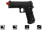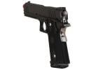 The WE Hi-Capa 4.3 has a metal slide, a metal frame, and a textured polymer grip. It is essentially a short double stacked 1911; the breakdown and the operation remain the same. The functional grip safety and ambidextrous slide safety make its operation safe for all users. The blow back action is operated by high pressure gas, such as green gas, red gas, or propane. The rail beneath the barrel on the frame is used for mounting accessories like the G&P M3 Pistol Flashlight. The reinforced metal parts include outer barrel, chamber, recoil spring rod, slide stop, safety, hammer, and trigger. The internal upgrade parts include reinforced recoil spring, hammer spring, firing pin, extreme high flow valve. This airsoft gun has the well established operation of the 1911 with the advantages of a double stacked magazine and a under barrel rail.