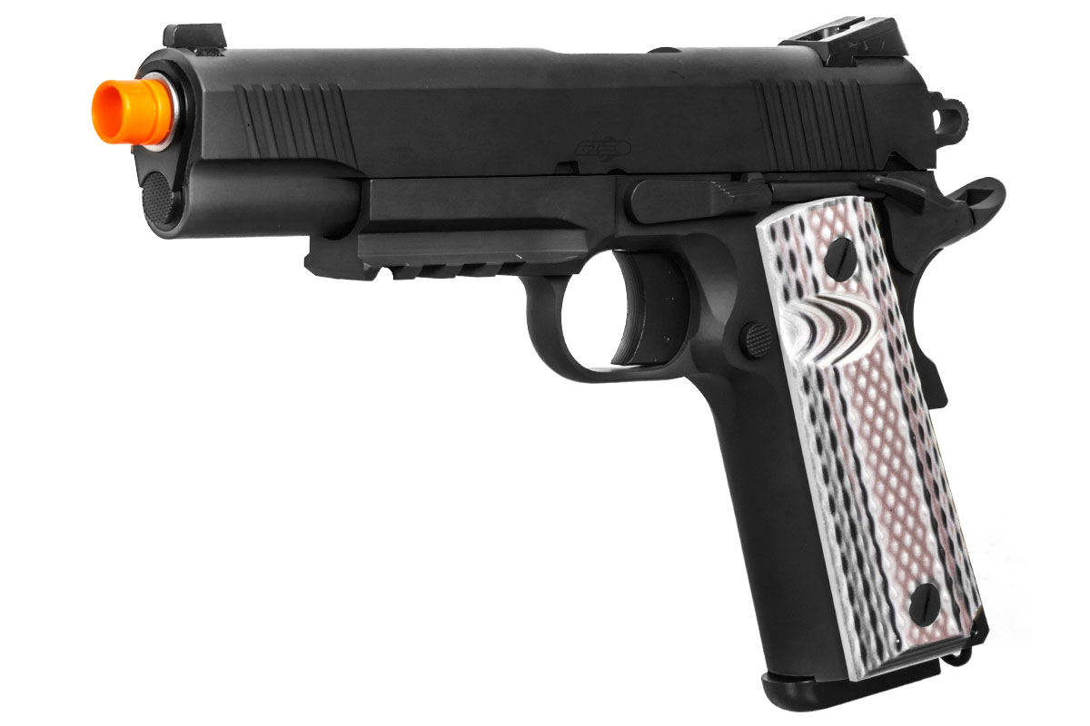 The WE M45A1 is a constructed out of metal with textured plastic hand grips to help keep this airsoft gun steady in your hands. The metal body feels great with solid feedback from the blowback action with every shot fired. Utilize the large cocking serrations on the front and rear of the to pull back the slide to start firing the airsoft gun. Toward the bottom front of the receiver is a rail section where you can attach accessories like flashlights, lasers or anything else you may need for your objective. Easily aim at your target with the visible white dotted front and rear sights. The WE M45A1 is an affordable airsoft gun that you can use as a side arm or even a primary weapon in your mission.