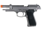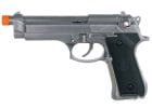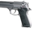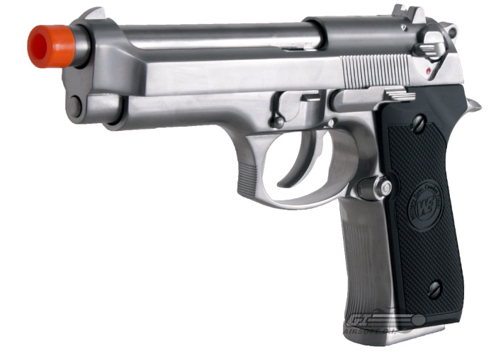 The M9 Silver is a very popular pistol replica of the current U.S. military issue side arm. The control operations and break down are almost the same as the real article. The slide release, ambidextrous safety, disassembly lever, and magazine release are all functional. In addition, loop at the base of the grip allows the user to attach a retention lanyard. Great gun for great price. The The WE model does not have trademarks on the slide.
