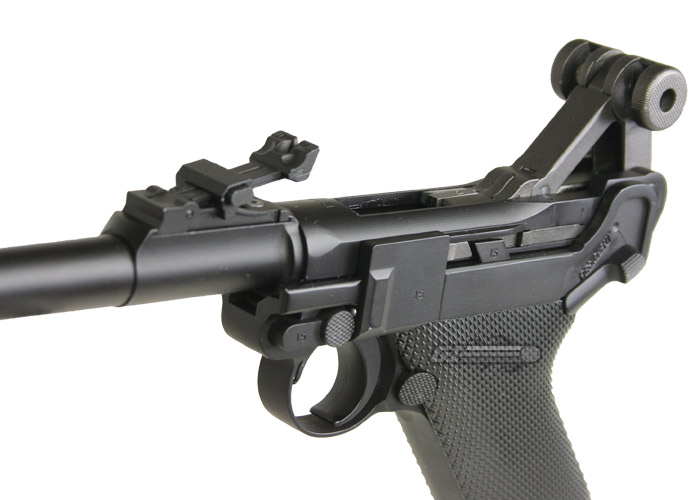 The WE Full Metal Luger (Long) is a replica of the famous semi-automatic pistol used by the German military during WWI and WWII. WE has done a fantastic job replicating their airsoft pistol to look, feel, and function like the real thing. The magazine cannot be loaded or into the gun unless the action is back or has been cocked back. Also, the magazine cannot be released unless the action has been cocked back. The rear sight is adjustable for distance. There is a functional safety and magazine release button. The handle is made of a durable ABS plastic but the rest of the gun is full metal, which gives a nice sound when fired.