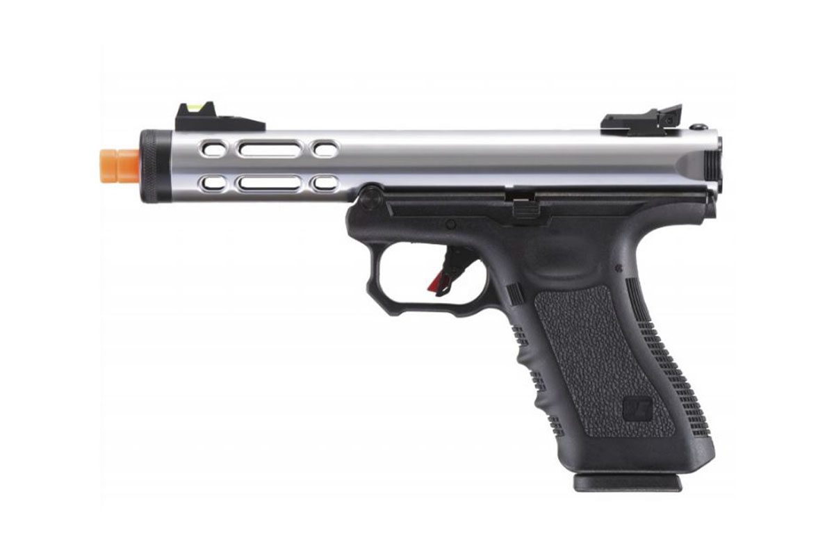 This pistol features a G-series style grip with modifications for even better ergonomics, including an undercut and front relief cuts that make it easy to maintain a stable hold. Whether using CO2 or Green Gas magazines, the Galaxy G Series offers a familiar yet improved experience, ensuring your shots stay on target.