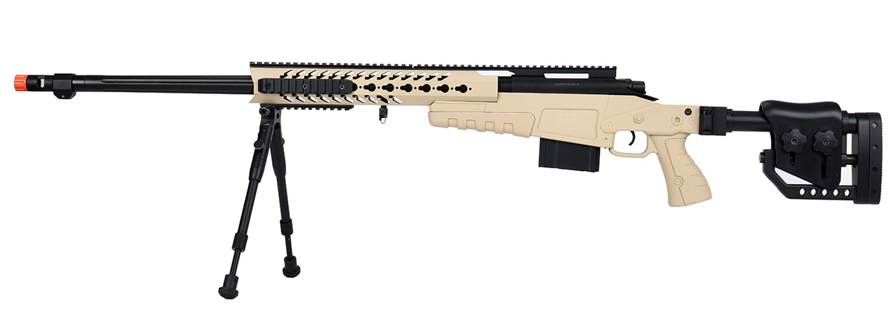 The Well MB4418-2 Bolt Action Sniper Rifle Airsoft Gun is most certainly one of the most intimidating spring sniper rifles on the market. The MB4418-2 has a L96 style fluted metal outer barrel. A polymer handguard with a keymod rail system allows you to mount any needed tactical accessories such as a bipod or laser. The polymer body is rigid and feature a front & rear metal sling points. The magazine well features a paddle style magazine release for rapid magazine swaps. The ergonomic pistol grip is contoured for maximum comfort. The foldable stock has an adjustable cheek riser to provide comfort for long distance shooting. The top picatinny rail is large enough to mount the biggest of optics and provide space for much more. The MB4418-2 is a great and inexpensive rifle for those who want fulfill the sniper role.