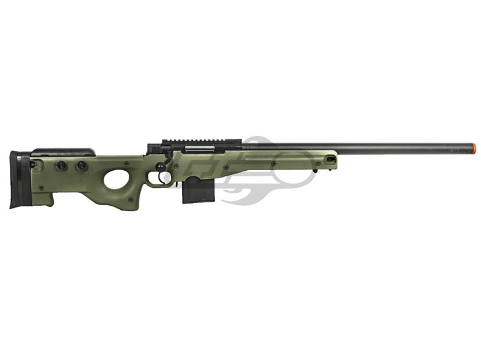 The Well L96 Compact Bolt Action Sniper Rifle is a durable and affordable airsoft gun for those looking to fill the role of the sniper. Externally, the Well L96 Bolt Action Sniper Rifle features a polymer stock and metal barrel and trigger assembly. The buttpad and cheek rest adjustable to provide the shooter with comfort and proper eye relief when shooting their rifle. The trigger mechanism is light, similar to the zero trigger system, making follow up shots quick and easy. Overall, this is a lightweight and affordable sniper rifle for those who prefer to engage at a distance without having to break the bank. In addition, this rifle's green color well help the rifle blend when it's used in woodland or jungle environments.