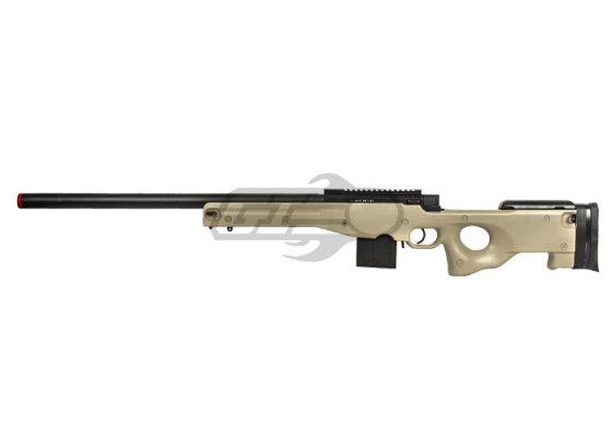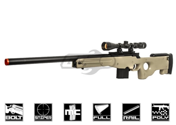 The Well L96 Compact Bolt Action Sniper Rifle is a durable and affordable airsoft gun for those looking to fill the role of the sniper. Externally, the Well L96 Bolt Action Sniper Rifle features a polymer stock and metal barrel and trigger assembly. The buttpad and cheek rest are adjustable to provide the shooter with comfort and proper eye relief when shooting their rifle. The trigger mechanism is light, similar to the zero trigger system, making follow up shots quick and easy. Overall, this is a lightweight and affordable sniper rifle for those who prefer to engage at a distance without having to break the bank. The tan color on this rifle will also help the gun blend in more when using it in a dry earth or desert setting.