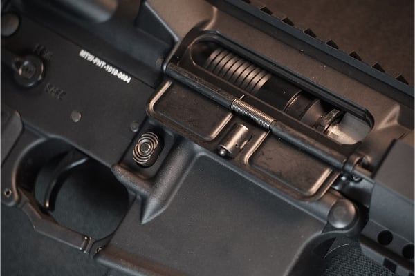 - Functional spring-loaded charging handle, forward assist, and dust cover