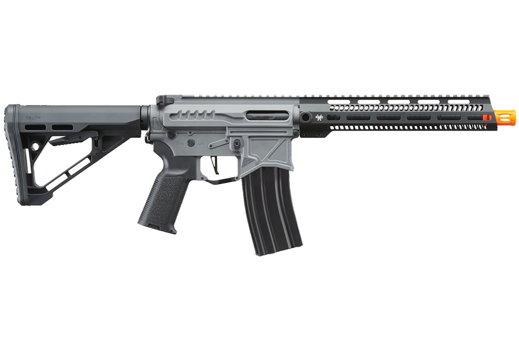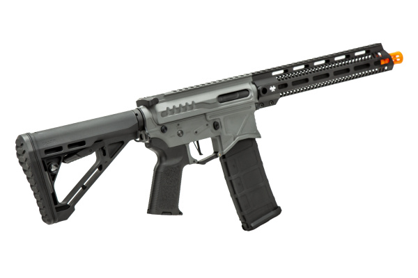 Zion Arms' debut airsoft gun hits the ground running! This new AR style AEG now sports all the essentials of a true carbine! The original finish remained from the first PW9 so it feels amazing in the hands and the finish looks absolutely stunning! Both the Outer barrel and rail system have been swapped for longer variations, and the rail is MLOK through and through with picatinny only at the top. The R15 AEG also sports a buffer tube and LT Delta stock for a minimalist low-profile aesthetic.