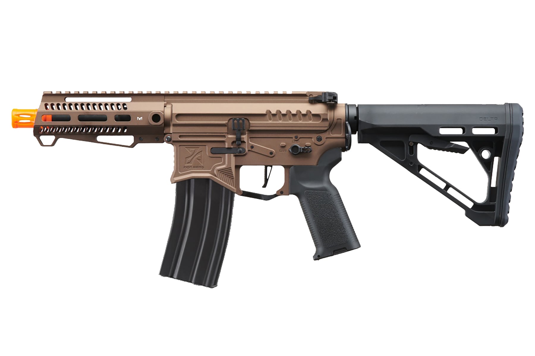Zion Arms' debut airsoft gun hit the ground running, and now all their various models are changing the game! This new AR style AEG now sports all the essentials of a true sbr! The original finish remained from the first PW9 so it feels amazing in the hands and the finish looks absolutely stunning! The M4 AEG also sports a buffer tube and LT Delta stock for a minimalist low-profile aesthetic.