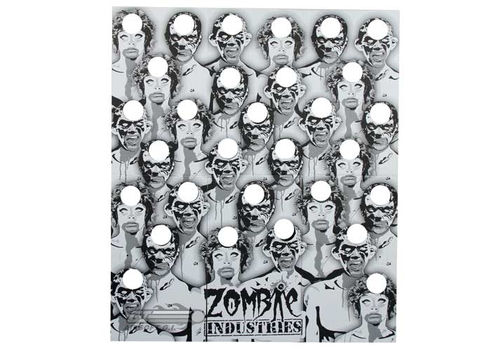 [Q11C01][10045 / 32-001]The guys over at Zombie Industries know that when the apocalypse comes, it won't be just one zombie that you'll need to take out, rather, it will be an entire horde of them. In preparation for this, they have created the Zombie Industries Outbreak 66x57"Cardboard Target - Zombie Face Off. This target is massive at 66x57", and has 30 perforated sections located where the zombie's infected brain would be that can be removed and replaced with clay pigeons for headshot practice. Each zombie head is life-sized, making sure that you can refine your skills for the real deal.